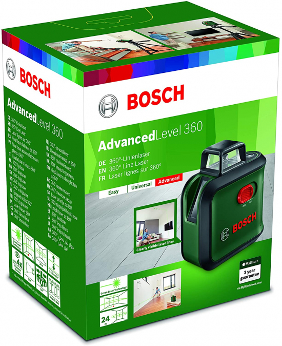 - Bosch Laser Technologie - Přesnost měření +/- 0.4 mm/m s pracovním rozsahem 12 m (24 průměr 24 m)