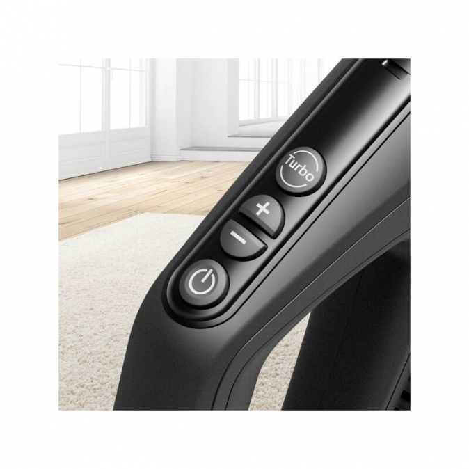 - Dálkové ovládání výkonu: snadno použitelná regulace výkonu přímo na rukojeti zajišťuje vynikající výsledky na všech typech podlah. Už žádné shýbání se kvůli nastavení výkonu pro různé povrchy. Dálkové ovládání výkonu umožňuje ovládat všechna nastavení přímo z rukojeti. Jedno stisknutí stačí pro přepnutí do režimu turbo, pohotovostního režimu nebo na požadovanou úroveň výkonu. Nyní si můžete vychutnat nejvyšší výkon vysávání na všech typech podlah.