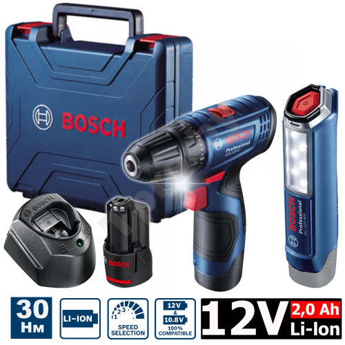 Bosch GSR 120 Li VRTACÍ ŠROUBOVÁK (2x2,0Ah, GAL1210CV, kufr, lampa) 06019G8004