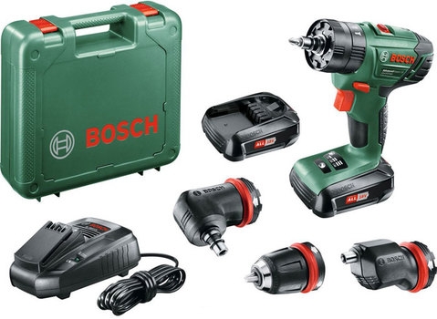 - 18V kombinovaná vrtačka se třemi různými nástavci: vrtacím sklíčidlem, excentrickým a úhlovým šroubovacím nástavcem