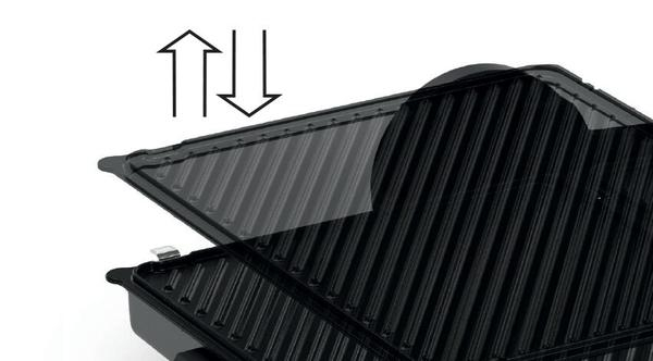 - Výškově nastavitelný pant umožňuje rovnoměrné propečení i silných plátků.