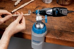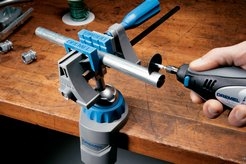 Dremel Multi-Vise 3-v-1. Stacionární svěrák, samostatná svěrka a stojan nářadí. Lze je upevnit na jekémkoliv ponku, stolu nebo pultu Otáčí se o 360° a naklání o 50°. Umožňuje přístup k obrobku z pohodlného úhlu. Čelisti lze použít s upínáním k pracovnímu stolu nebo jako samostatnou svěrku. Snadno pojmou větší obrobky. Lze do nich upínat i rozměrnější předměty a nepoškozují choulostivé součásti. Umožňují i upínání okrouhlých a nepravidelných předmětů. Urychluje uvolnění předmětů ze svěráku. Stabilní, odolná v krutu i ohybu. Možnost nasazení nástavce DREMELite.
